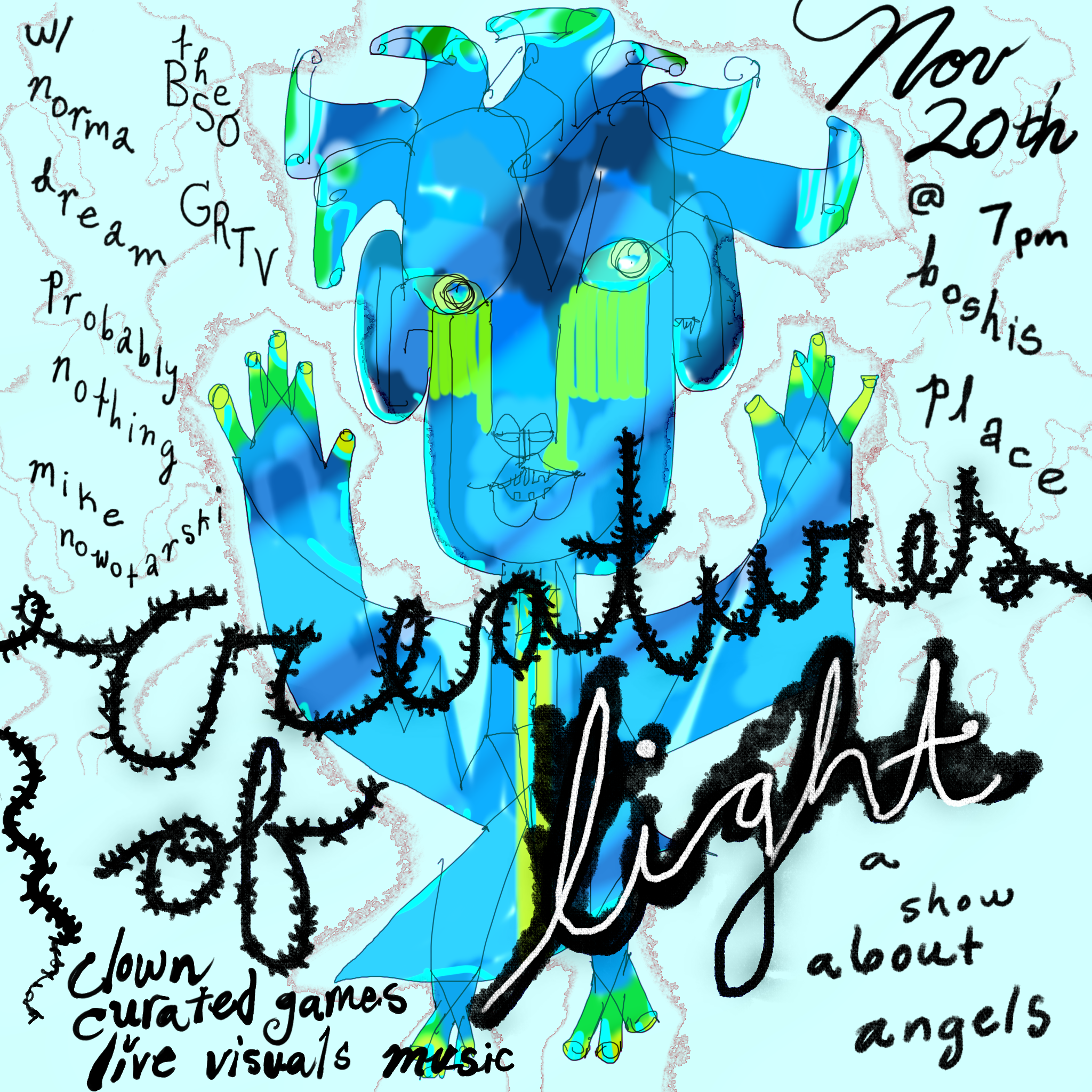 come touch and be touched by an assortment of angelic beings. angel flavored, angel misted, angel printed, angel fitted--bring angels, be the angels in the room with us. the angels will be in the computer, the angels will push little toy instruments into your hands. clown angel, singing angel, rapping angel, feedback angel, skating angel, dream angel. DIVINE AND DREADFUL CRYPTIDS OF LIGHT!!!
