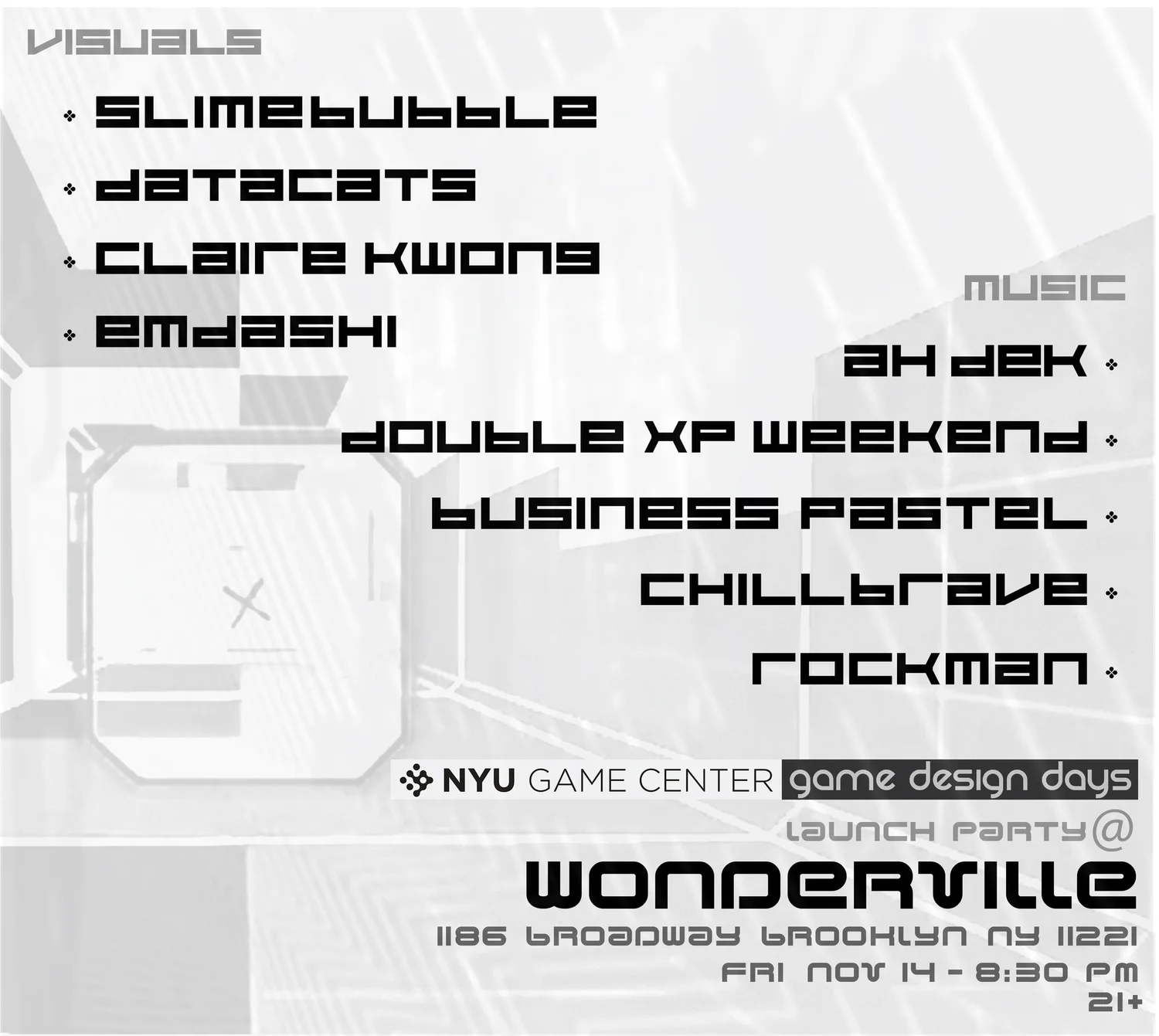 Game Design Days launch party kicks off with chiptune musicians Ah Dek, Double XP Weekend, Business Pastel, Chillbrave, and Rockman, with visual art projections all night by artists Slime Bubble, datacats, Claire Kwong, and emdashi.