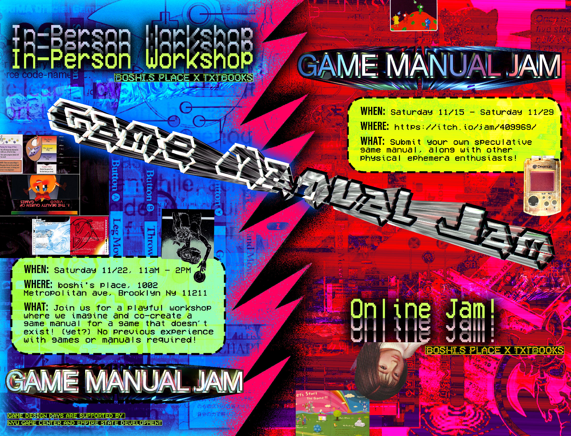 Join us for a workshop where we imagine and co-create a game manual for a game that doesn’t exist! (yet?) Expect to play and craft, learn about cool game manuals of history, and contribute to a new speculative manual together. No previous experience with games or manuals required!